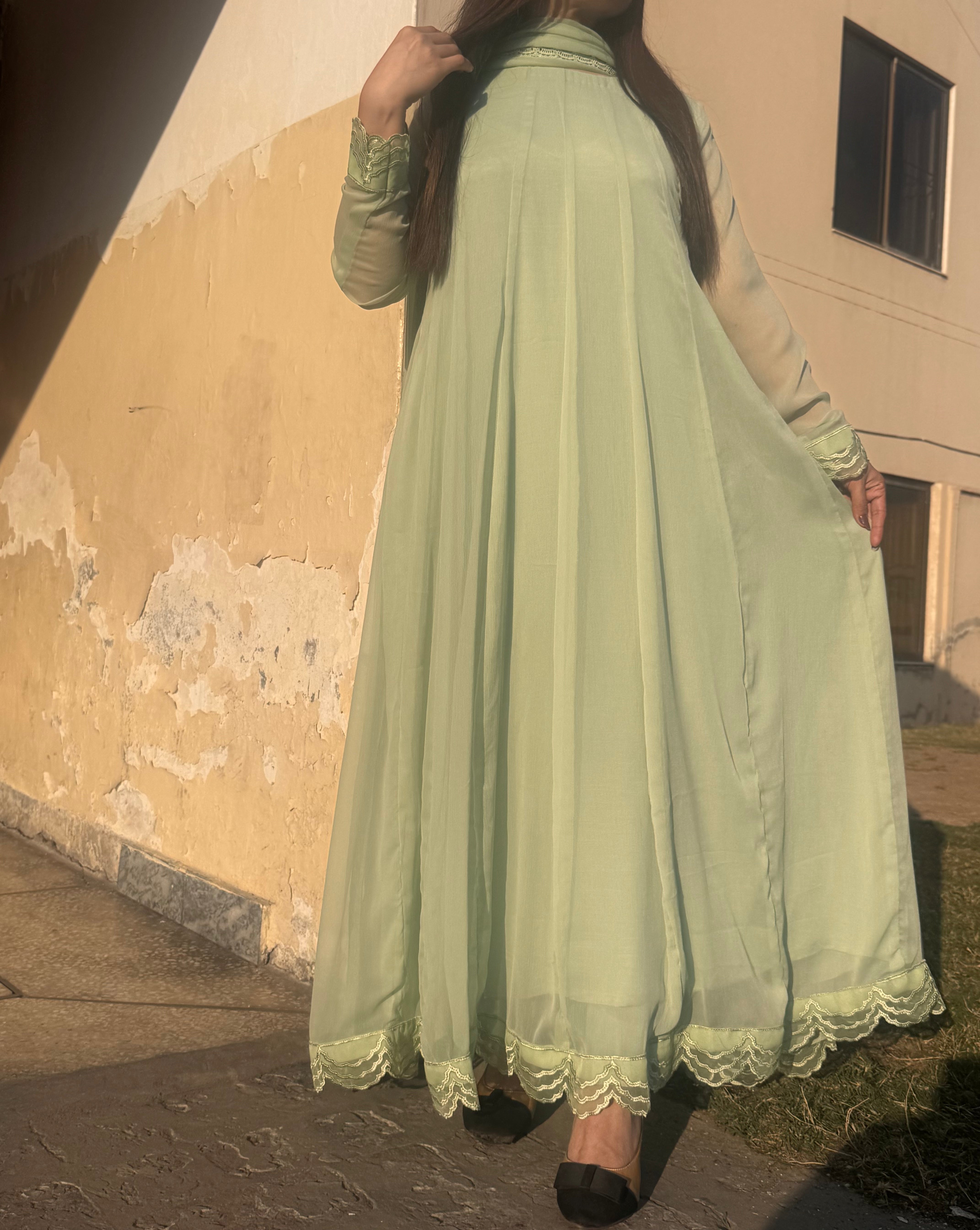 Embrace effortless elegance with this pistachio chiffon frock, beautifully crafted with embroidered lace and a flattering paneled design. The matching chiffon dupatta and premium raw silk pants enhance its luxurious feel, making it a must-have for Eid and festive occasions.