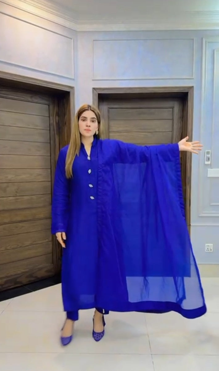 Add a touch of luxury to your wardrobe with this Ready-to-Wear 3pc ensemble, crafted from pure Korean raw silk for a rich and elegant look. The outfit includes a beautifully tailored shirt and pant, paired with a pure organza dupatta adorned with delicate pearl tassels. Perfect for festive occasions, semi-formal gatherings, and special events, this outfit combines timeless style with contemporary detailing.