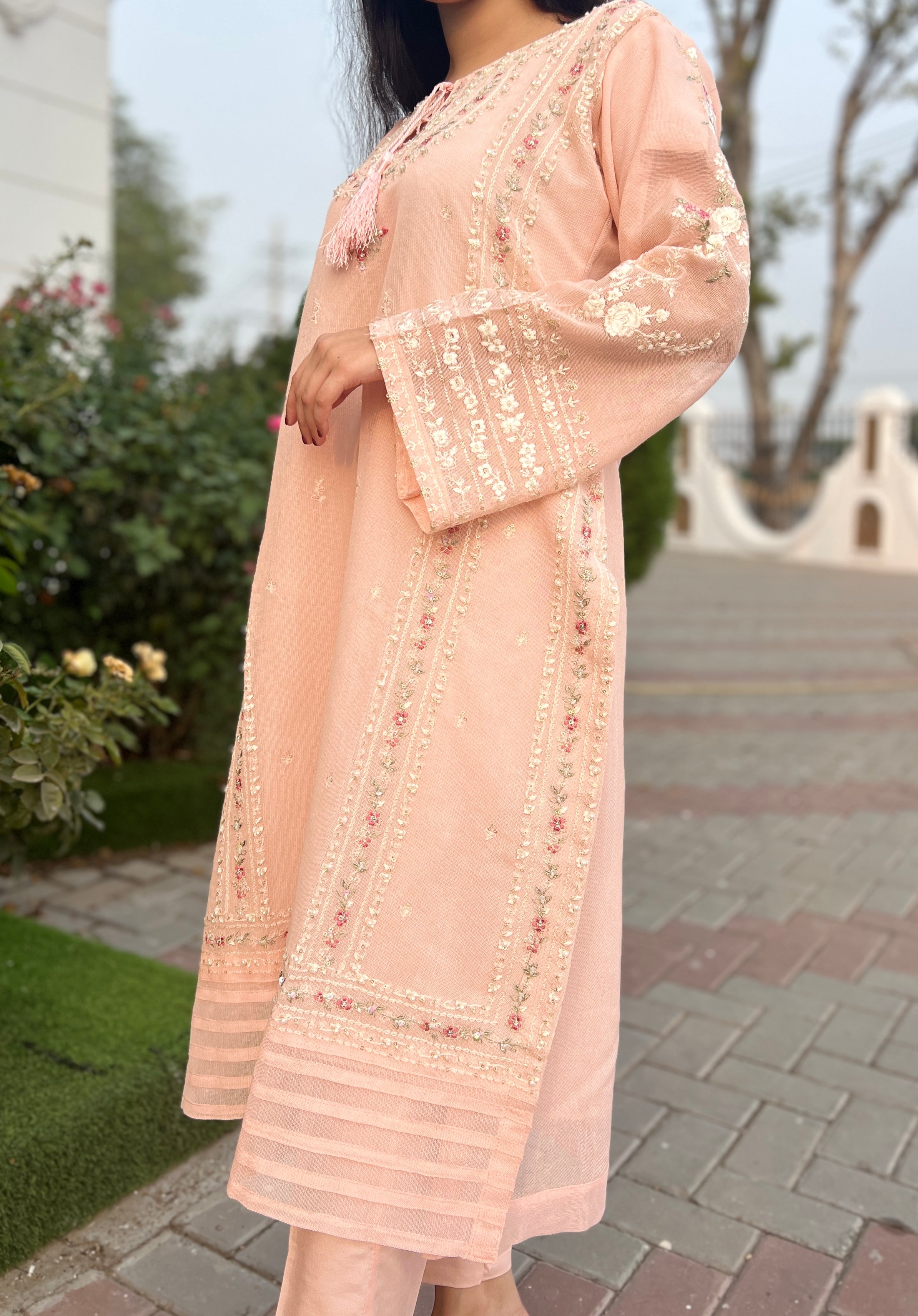 Elevate your wardrobe with this Ready-to-Wear 3pc ensemble, designed to exude elegance and sophistication. Crafted from luxurious pure cotton net and paired with a stunning khaddi net dupatta, this outfit is perfect for making a statement. The beautifully embroidered shirt and dupatta showcase intricate craftsmanship, making it ideal for festive occasions, semi-formal gatherings, or stylish casual wear.