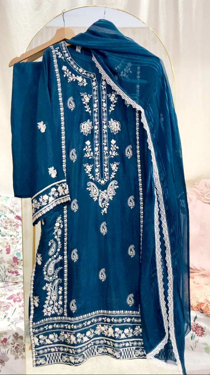 Elevate your wardrobe with our exquisite rosy silk 3-piece set, designed to embody timeless sophistication. The silk shirt, embroidered front and back, is delicately adorned with sparkling stone hand-embellishments for a truly luxurious finish. Paired with a flowing chiffon dupatta and elegant trousers, this ensemble is the perfect blend of modern grace and classic beauty — ideal for festive gatherings, weddings, and special occasions.