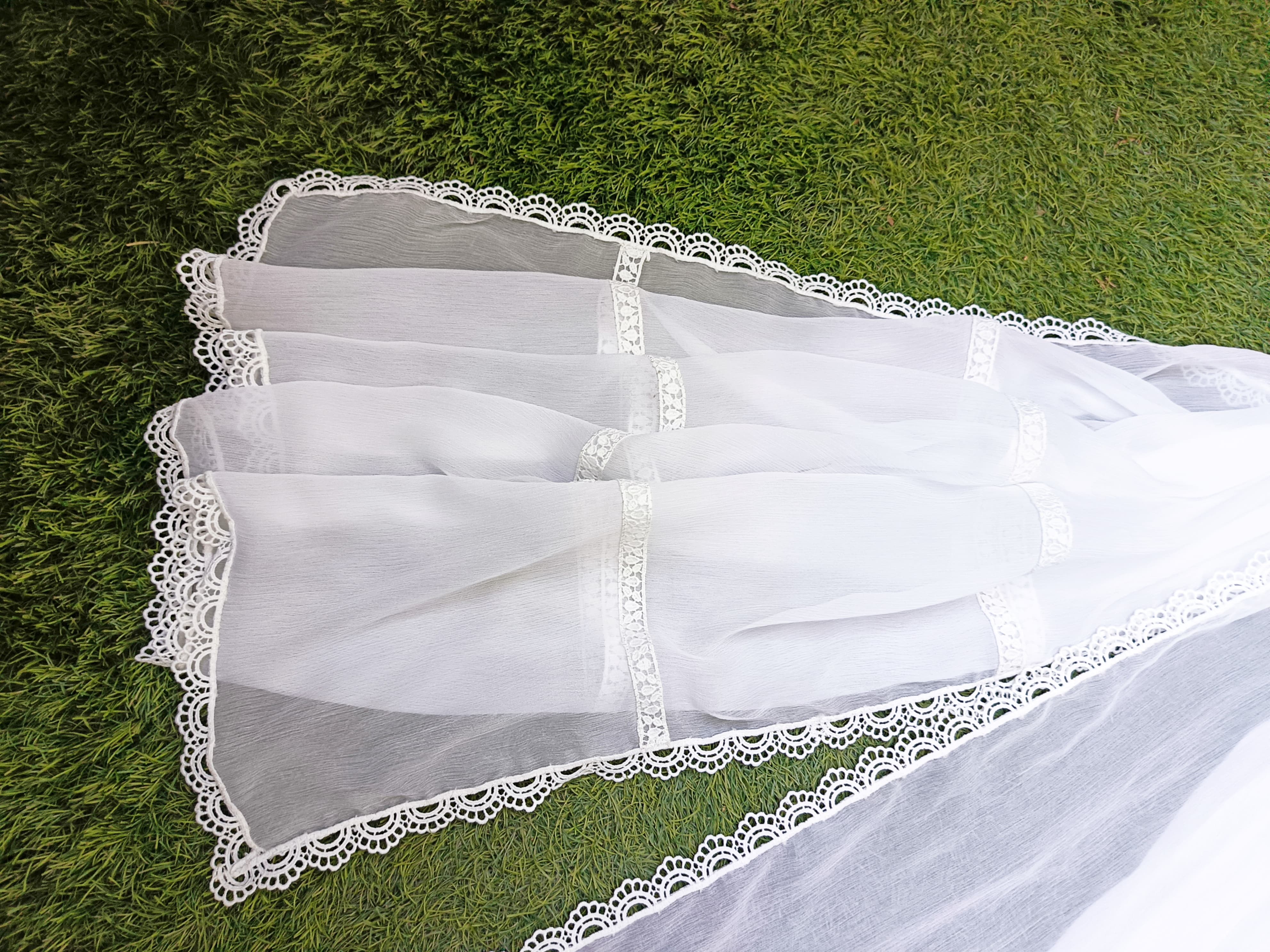 A breath of elegance — this white chiffon dupatta is adorned with a delicate arched lace border, giving it a graceful, feminine finish. Its soft, sheer texture and refined detailing make it an ideal choice for daytime events, Eid, and bridal showers.